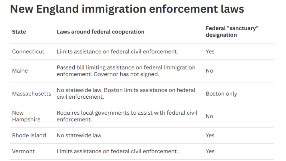 Journalists at Maine Public, NHPR, Vermont Public, NEPM, WBUR, GBH, Connecticut Public and Ocean State Media contributed to this story. How are New England states responding to the federal deportation push?was originally published by Ocean State Media and is republished with permission.